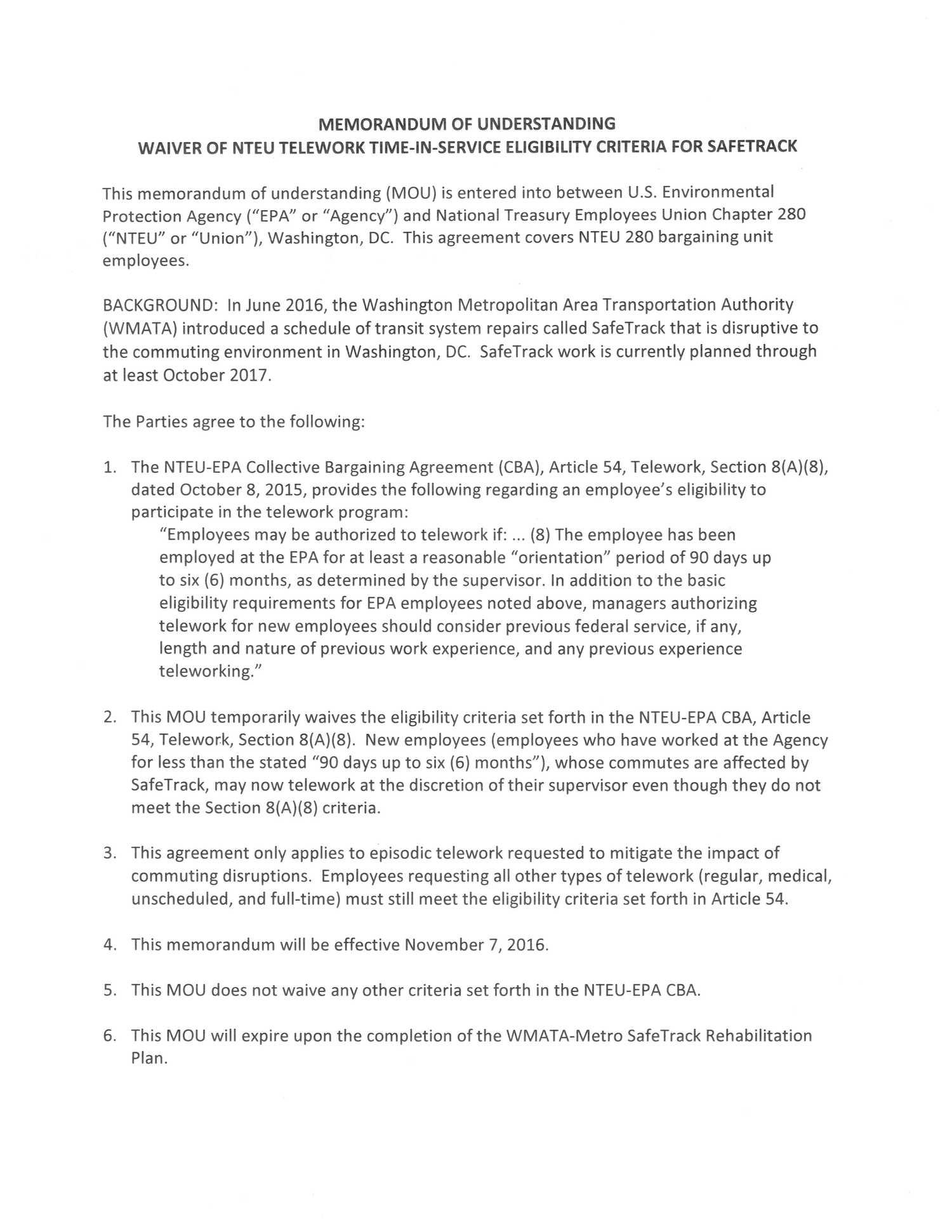 Telework:  Waiver of Time-in-Service Eligibility for Safetrack