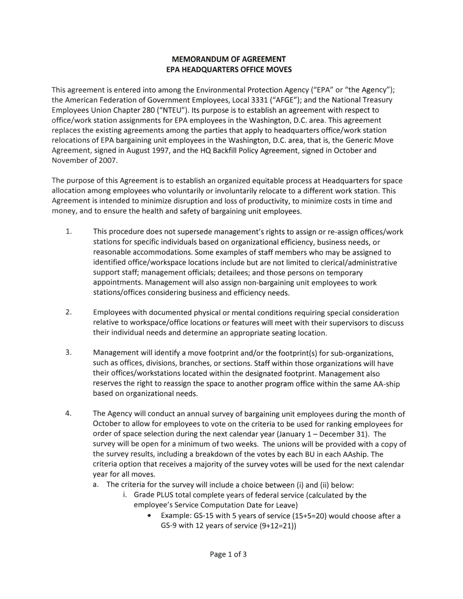 MEMORANDUM OF AGREEMENT:  EPA HEADQUARTERS OFFICE MOVES