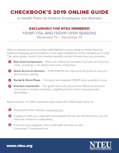 It will remain available throughout 2019 for NTEU members who are new hires or are current enrollees with a qualifying life event change. The online guide was developed by Consumers’ Checkbook, a nonprofit organization that has published an annual paperback version of its guide for more than 30 years.